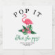 "Lägg av. När hon poppar!" Utformningen av babyduschinbjudan har rosa flamingo med lush grönt löv fronds och tropiska hibiscus blommor. "Aloha Baby". Ett tropiskt blommönster med svart bakgrund färg går bakåt på kortet.