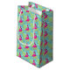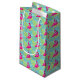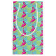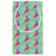 Rosa flamingo-presentpåsar i vatten och handflatan