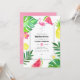 Inbjudan till Bachelorette med exotiska tropiska blad och blommor, färska frukter och en flamingo.