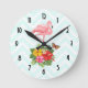 En klocka med en söt digital illustration med en rosa flamingo med ett ben upphöjt. Stående på en bukett av tropiska hibiscus blommor och löv. En söt fjäril håller på att hovra runt blommorna. En ljust grönt och vit schevron mönster i bakgrunden.