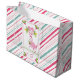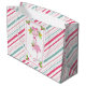En liten, tropisk julklapp - stor storlek. En flamingo i finare rosa med ett ben upphöjt. Med en rosa-tomhatt och lite säsong holly. Holly med bär dekorerar också hörnen. En blommigt bukett med polkagrisar ovanför hennes huvud. En rosa och grönt candy cane har stridit bakgrunden. God jul är skrivet i grönt i modern skrift.