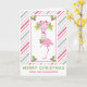 Ett pisktropiskt hälsningskort - vikta kort stil.. En rosa och grönt candy cane har stridit bakgrunden. Överst är en flamingo i finare rosa med ett ben upphöjt. Med en rosa-tomhatt och lite säsong holly. Holly med bär dekorerar också hörnen. En blommigt bukett ovanför hennes huvud med polkagrisar korsade ihop.