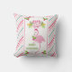 En visktropisk julkudde. En rosa och grönt candy cane har stridit bakgrunden. Överst är en flamingo i finare rosa med ett ben upphöjt. Med en rosa-tomhatt och lite säsong holly. Holly med bär dekorerar också hörnen. En blommigt bukett ovanför hennes huvud med polkagrisar korsade ihop.