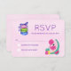 Ett platta svarskort för OSA med rosa vattenfärgsbakgrund. En söt flamingoillustration med vattenmeloner och ananas. En trio makaroner som är täckt med en båge.