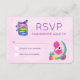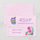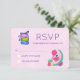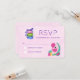 Ett platta svarskort för OSA med rosa vattenfärgsbakgrund. En söt flamingoillustration med vattenmeloner och ananas. En trio makaroner som är täckt med en båge.