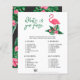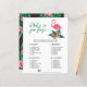 Utformningen av babyduschinbjudan har rosa flamingo med lush grönt löv fronds och tropiska hibiscus blommor. "Aloha Baby". Ett tropiskt blommönster med svart bakgrund färg går bakåt på kortet.