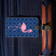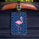 En gåva som presenterar en illustration av en rosa flamingo. Bakgrund är marinblå quatrefoil. Personifiera med din monograminsida cirklar på flamingos förkroppsligar.