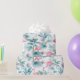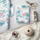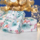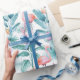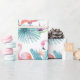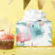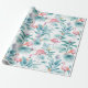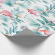 Tropiskt löv och blommor med rosa flamingos i ett sömlöst mönster på vit bakgrund.