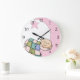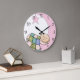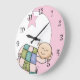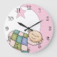 Rosa flicka klockor med söt baby som sover på måne med stjärna och rosa bakgrund. Söt design för ett baby-rum, ett nyfött lekrum eller unga flickor.