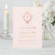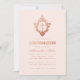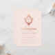 Denna eleganta rosa och roséguld bekräftelseinbjudan med vintagekänsla, rekommenderas för en flicka, har en vinatge floral vapensköld med kors i, båda i (falskt) roséguld-folie. Flickans namn är skrivet med en elegant kalligrafisk stil. Texten har en färg liknande den roségulds vapenskölden. Bakgrunden är rosafärgad.