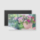 "Kindness, kärlek och prayer är de bästa gåvorna till " V.M. Rosa och lila blommor som växer i en blomkruka för rosa av elegant mot bakgrund av lush grönt foliage. Vackra vibrerande fotografimagnet med inspirerande motiverande citat i elegantens moderna typografi. Underbar för en minimeditation på resan hemma eller på kontoret. Markera alternativet att lägga till en söt miniuppställning för ett underbart presentobjekt.