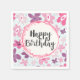 pappra servetter från grattis på födelsedagen med sött blommönster. Består av rosa och lila, oregelbundna blommor i en sextiotalsgroovi stil. Fläktade blåa hjärtan, peppar bakgrunden på en blek blå bakgrund. Centrumet har ett sött cirkulärt ram med ord grattis på födelsedagen i ett sött trendig.