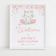 En söt kattunge-dusch poster välkomstskylt. Utformningen har vitaktiga blommor i rosan och en söt illustration av baby-katten.