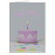 En rosa tecknad födelsedagstårta med sprinkeltäckt frost som springer ner från sidorna och ett tänt ljus sitter på en gyllene platta på en räknare som är täckt av färgade prickar.