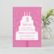 En rosa med ballonger och en vit kaka med tända ljus. Texten visas inuti kakan för en roligt och ett informativt inbjudan. Bakgrunden på kortets framsida har en rosa rand mönster.