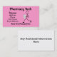 Farmakoterapeut Affärskort rosa, designad farmaceut, " springa med recept ". Kontaktinformation för anpassadet på kortets framsida och baksida. Färg kan också bytas ut av köparen.