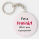 "Jag är feminist, vad är din supermakt?" En roligtens slogan med seriös avsikt. Texten står i fet svart text på blekens rosa, med "feminist" i djup rosa för kontrast.