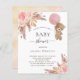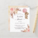 För en modern boho stil babydusch. Vit bakgrund på framsidan. Dekorerad med ro guld och rosa blommigtar, rosor, pampasgräs och en nalle flicka som håller en rosa ballong. Anpassa och lägg till information om namn och party. Tillbaka: A ro guld, rosa, gul, metallisk tittar bakgrund.