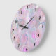 Stor väggklocka i en rosa abstrakt utformning med snurrar och faux-gnistor. Färg av blått, grönt och persika läggs också till för en söt klockdesign.
