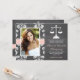 Tillfoga din foto eller favorit- bild till dessa tillkännagivande för studenten och inbjudningar för juridisk fakultet för snöre för lantlig och nätt svart tavlastil damastast med fjäll av rättvisa i en stil för kritalookkonstverk och en utskrivaven rodna rosor sydd bandlookdesign. Skräddarsy den till den spelar ingen roll något att säga dig önskar på baksidaen och beklär av meddelandet och inbjudan för advokatstudentstudenten. Konstverk© Chrissy H. Studio, LLC. All reserverad rättigheter.