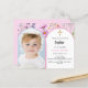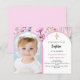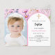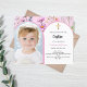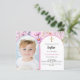 Lägg till ditt eget foto i stående format. En rosa båge formad som en fotoram. En vit bakgrundsfärg. Dekorerad med rosa blommor och ett gyllene kors. Anpassa och lägg till ett namn och detaljer.