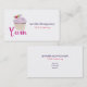 Affärskort med texten Yum! Designad med en illustration av en yummikaka med rosa snurrar och ett bär med löv inkapslat i frosten.