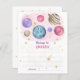 VATTERCOLOR Magic galaxy rymden tog upp födelsedagsinbjudan. Planeter och stjärnor i rosa, lila, guld.