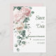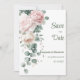 En färgsblomma av pastel färg med vackra rosa- och mint grönt-trädgårdsboonier och eukalyptus löv Inbjudan till Bröllop spara datum är ett perfekt som par tittar för en romantisk beröring till sin stora dag. Den här handmålade vattenfärgsblomman ram omger dina uppgifter om bröllop. Ge dina gäster en underbar första glimt av bröllop till komen. Den här inbjudan blir ett fantastiskt tillägg till era bröllop-evenemang.