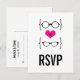 Quirky och chic Geeky Glasses Bröllop Response Postcard med ett ljust rosa hjärta täckt av två par geeky-glasögon, ett manligt par och ett giftigt par som representerar stam och brud. Det här sofistikerade vykortet för OSA är perfekt för ditt nervösa bröllop! Enkel att anpassa, lägg bara till informationen om din stora dag i den fält som tillhandahålls. Klicka på knappen "Anpassa" för att hitta ytterligare anpassningsalternativ.