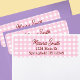 Returadressetiketter i en söt stil med feminina texter på rosa gingham-bakgrund. Anpassa genom att lägga till ditt namn och adress i redigeringsfönstret.