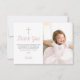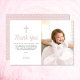 Tack till din familj och dina vänner för att du har gått på flicka första födelsedag och baptism med ett foto av ditt barn. Den rosa designen har vit polka dots på en rosa vattenfärgsbakgrund på baksidan av kortet. All text kan anpassas, inklusive ditt barns namn och meddelandet.