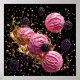 Dynamisk och vibrerande visning av glassskopor i rosa, artificiellt placerad mot svart bakgrund. Glaset är förskönat med ett glansigt struktur och har droppar som ökar dess attraktionskraft. Omringningen av skoparna är björnbär, vilket tillför en kontrasterande mörk färg. Dessutom finns det stänk av en gyllene vätska, som tillför rörelse en känsla av upphetsning och upphetsning till sammansättningen. Samspelet mellan färg, struktur och känslan av levitation skapar en synligt slående och aptitretande scen.