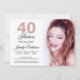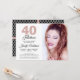 En chic, elegant, 40-års födelsedagsfoto-inbjudan som du kan anpassa och skicka ut för din fyrtioårsfirande. Orden "40 och fantastisk" i rosa glitter och svart är satta med modern typografi. Lägg bara till dina egna personliga detaljer och ditt eget foto. Det finns ett svart och vitt diamantmönster på baksidan av kortet med rosa glitterband. Om du behöver hjälp eller matchande produkter, vänligen kontakta oss via vår butik.