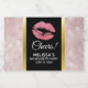 Bachelorette Party (eller någon annan händelse) mini-mousserande vin flaska-etiketter med en bakgrund som består av ett modernt ro guld-tropiska löv mönster. Överst är ett svart ram med guld övertoning gräns, innanför är rosa glitter läppar.