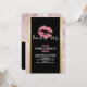 Bachelorette-inbjudan med en bakgrund som består av det moderna trendiget ro guld tropiska löv. Överst är ett svart ram med guld övertoning gräns, innanför är rosa glitter läppar.