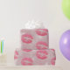 Förfalskad inslagning papper med en bakgrund som består av ett modernt trendig ro guld tropiska löv mönster. Överst är rosa glitter läppar i ett upprepande mönster.