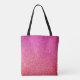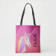 Rosa Glitter Rainbow Unicorn Personlig Girls Tote BagUtformad med rosa faux glitter bakgrund på båda sidor. Framsidan har en söt vit encorn ansikte och hon har regnbåge och blommor på huvudet. Personlig med namn i svart kalligrafi-skript med text på högernas framsida lodrätt till enmajshuvudet.