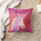 Rosa Glitter Unicorn Rainbow Sparkles Personlig Dekorativ kudde gör ett underbarare sovrumsdekoration för en flicka som kärlek uniçorns. Båda sidor av kudden är designad med rosa ros guld faux glitter. Framsidan har en söt vit enhörnig ansikte och huvud och hon har regnbåge och blommor. Personlig med namn i svart kalligrafskript med text över kuddens övre del.