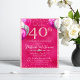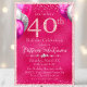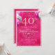 Denna anpassade festinbjudan har ett fantastiskt 40-års födelsedagstema på en het rosa folie bakgrund. Silver- och rosa glitterballonger placeras på vardera sidan om det fyndiga 40-årsjubileet, som är tryckt i ett ljust rosa glitter-mönster, följt av evenemangsinformationen och platsen. Ett glamoröst band av diamanter är tryckt under hedersgästens namn. Konfetti accentuerar de övre och nedre delarna. Det är perfekt för en födelsedag, årsdag eller annan speciell tillställning.