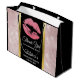 Brudtärna-fest (eller annan händelse) presentpåse med en bakgrund bestående av ett modernt trendigt roségult tropiskt blad-mönster. Över detta ligger en svart ram med en roséguld gradientkant, inuti finns rosa glitterläppar.