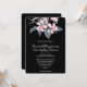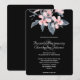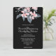 En bröllopsinbjudan med en snygg vattenfärg illustration av rosa blommor med grå blad på en enda stjälk. En modern elegant botanisk design. svart bakgrund.