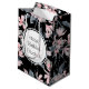 Grattis på födelsedagen-presentväska med en elegant mönster med en vattenfärgad illustration av rosa blommor med blå grått löv och stjälkar. Klassisk svart bakgrund. En vit cirkel som läggs ovanpå med texten inuti.