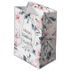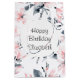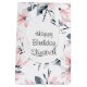 Grattis på födelsedagen-presentväska med en elegant mönster med en vattenfärgad illustration av rosa blommor med blå grått löv och stjälkar. En vit cirkel som läggs ovanpå med texten inuti.