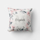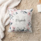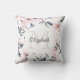 En kudde med elegant mönster, med en vattenfärgad illustration av rosa blommor med blå grått löv och stjälkar. En vit cirkel som läggs ovanpå med ditt namn och som initialt innehåller ett monogram.