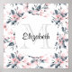 En poster med en elegant mönster som är gjord med en vattenfärgad illustration av rosa blommor med blå grått löv och stjälkar. En vit cirkel som läggs ovanpå med ditt namn och som initialt innehåller ett monogram.