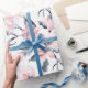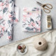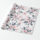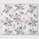 Omslagning papper med en elegant mönster gjord med en vattenfärgad illustration av rosa blommor med blå grått löv och stjälkar.