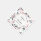 Bröllop blöjor med elegant mönster med vattenfärg som illustrerar rosa blommor med blå grått löv och stjälkar. En vit cirkel som läggs ovanpå med texten inuti.