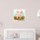 En poster för ett barnhem eller ett bondhuskö för att få dig att le med en nyfiken rosa gris som leker på ett stängsel för att säga hej omgiven av vilda blommor och gräs av gult som illustreras med vattenfärg.