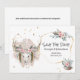 En akvarell hjorthuvudskalle med ståtliga horn prydd med rosa rosor; anemoneblommor; fjädrar och kristaller vilar mot en abstrakt blekbeige fläck omgiven av falska guldflingor. Till höger finns en abstrakt falsk guld vågig cirkelkontur som ramar in textmallar. En snygg krukväxt fylld med grönska; rosor och en fjäder vilar i det nedre högra hörnet. Anpassa texten; lägg till en bakgrundsfärg och lägg till ytterligare information på baksidan eller rensa mallen om det inte krävs.
