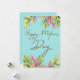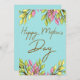 Elegant Rosa Grönt Gult Löv Bouquet Mor's Day Greeting Card. Söt Brown Burgundy-skripttypografi på blå bakgrund.